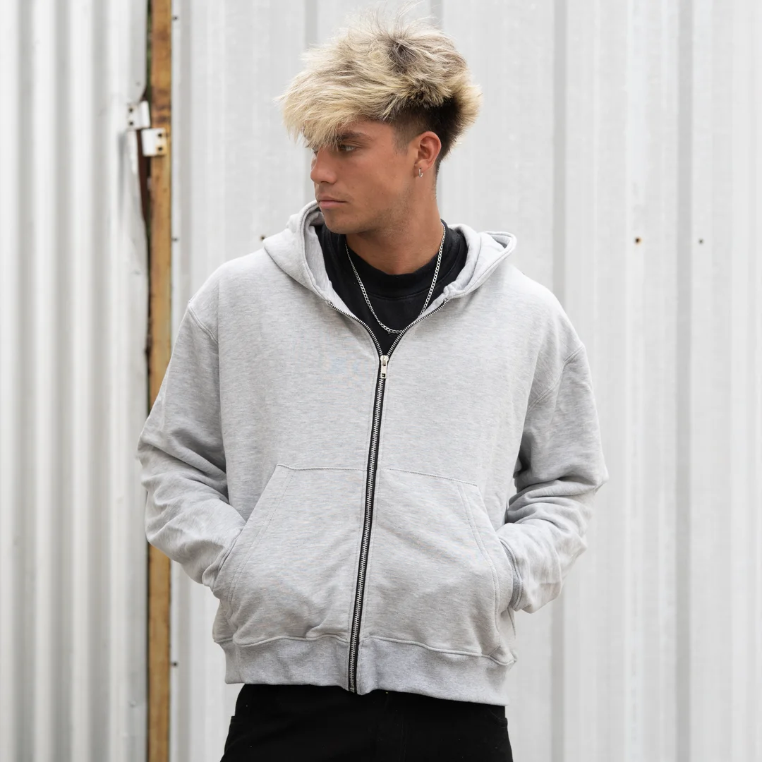 Ziphoodie Gris Melange confeccionado en rustico de la mejor calidad, una prenda perfecta para invierno. bolsillo canguro, costuras reforzadas, capucha forrada y reeb de morley.